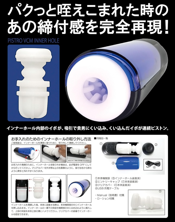 標準インナーホール「PISTRO VCM INNERHOLE」搭載。 挿入物に向けて伸びる大きく長いイボを多数配置し、四方八方から絡みつきます。