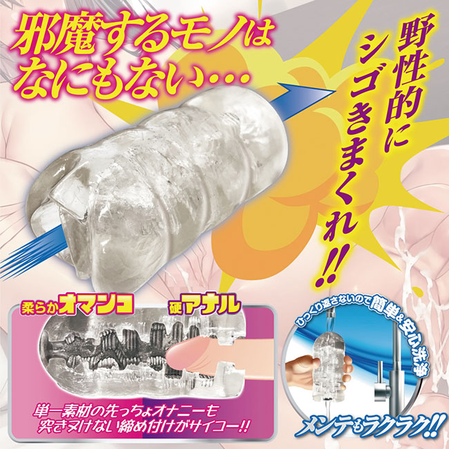 肉厚透明素材がググっと締め付ける! ソフト素材とハード素材のシームレス貫通ホール。 中まですけすけのクリア素材を採用した丸見え貫通ホール。 膣側の入口はソフト素材、お尻側の入口はハード素材を使用し、 シームレスな硬さの変化を楽しめます。
