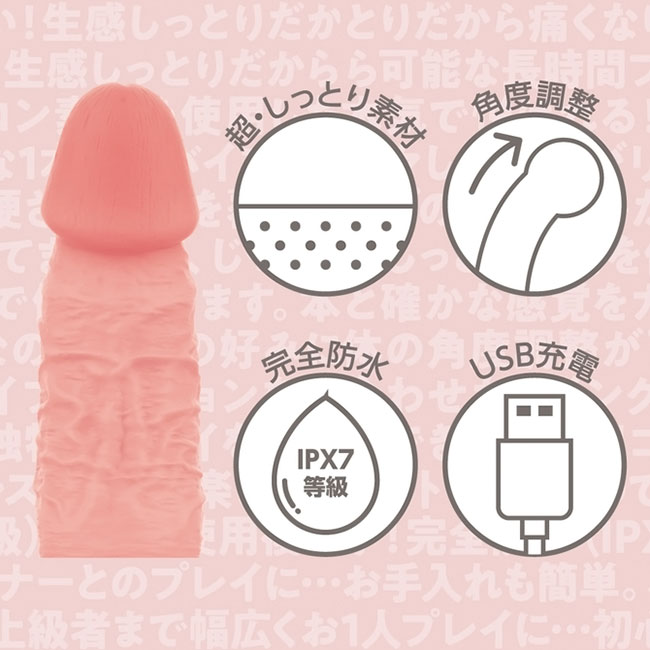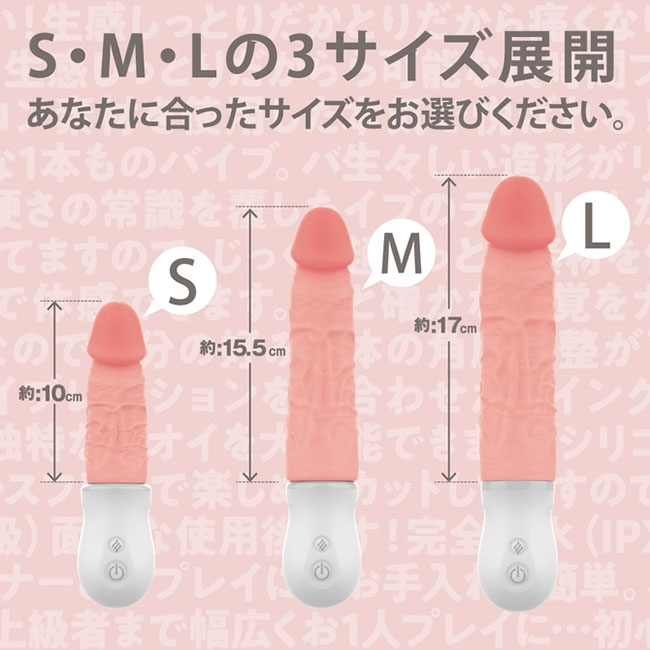 生感しっとりだからズッポリ密着!生感しっとりだから痛くなりにくい! 生感しっとりだから可能な長時間プレイ!生感しっとりだから本気で悦ばれる! シリコン素材を使用した生々しい造形がリアルな1本ものバイブ。 バイブのデメリットだった硬さの常識を覆した超しっとり素材を使用してますので、じっくりと確かな感覚をカラダで体感できます。 本体の角度調整が可能なので自分の好みに合わせたスイング&バイブレーションを堪能できます。 シリコンの独特なニオイを大幅カットしてますのでストレスフリーで楽しめます!完全防水(IPX7等級) 面倒な使用後のお手入れも簡単。パートナーとのプレイに…1人プレイに… かわいいSサイズ!初心者〜上級者まで幅広くお使いいただけるアイテムです。 付属品:USBマグネット式充電ケーブル