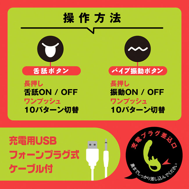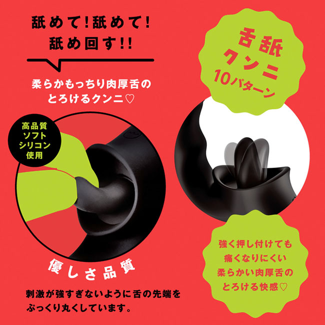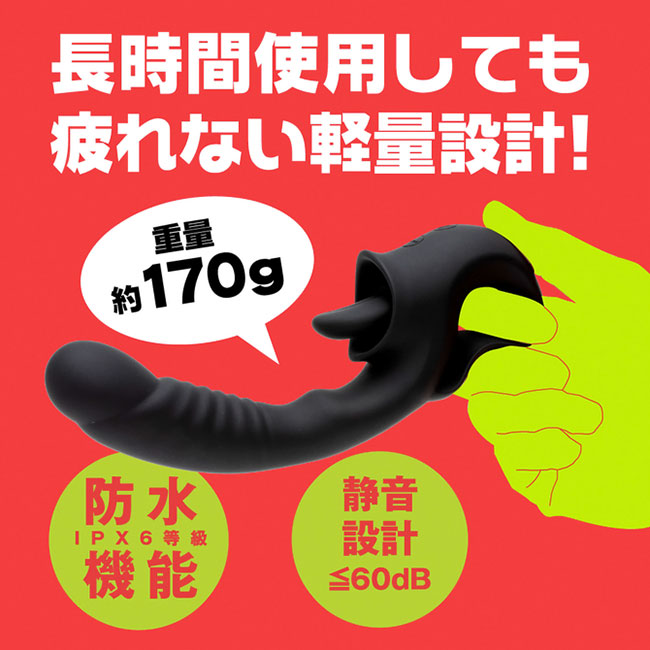 最強のバイブ×最強のクンニで新体験! 挿入しながらクンニされるという現実では難しいW絶頂パターン! 舐めて舐めて舐め回す柔らかもっちり肉厚舌のとろけるクンニ! 高品質ソフトシリコンを使用し、刺激が強すぎないように舌の先端をぷっくり丸くしているので、とても滑らかで優しい感触になっています。 挿入長120mm、最大径33mmで挿入しやすいちょうどいいサイズ感・重量約170gで長時間使用しても疲れない軽量設計になっています。 マンネリしない多彩な100バリエーション! 繊細タッチな微振動からパワフル振動まで豊富な10パターンのバイブ刺激! 強く押し付けても痛くなりにくい柔らかい肉厚舌のとろけるクンニ10パターン! 静音設計 ≦60dB。 防水機能IPX6等級 ※IPX6:放水ノズルを使って噴流水を最低3分間あてる試験(浸水は不可 可愛いピンクの相棒です★