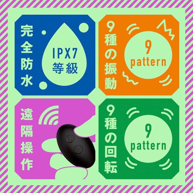 ※本体:充電時間約90分 ※本体:連続稼働時間約50-70分(初期振動パターン未変更時) ※防水:IPX7等級 ※付属品:リモコン・充電用USBケーブル。