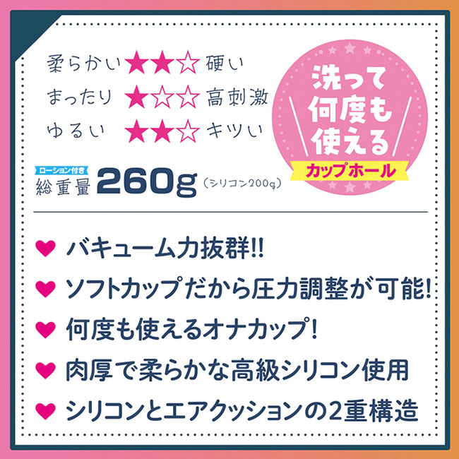 新感覚!洗って何度でも使える、ソフトカップタイプのカップホールです。 ソフトカップだから圧力調整が可能!調整可能なエアバルブでバキューム力も抜群! シリコンとエアクッションの2重構造で肉厚柔らかな高級シリコンを使用。 シリコン部分を外して洗えば何度でも使えます。 衛生的で安心な別途ローション付属!