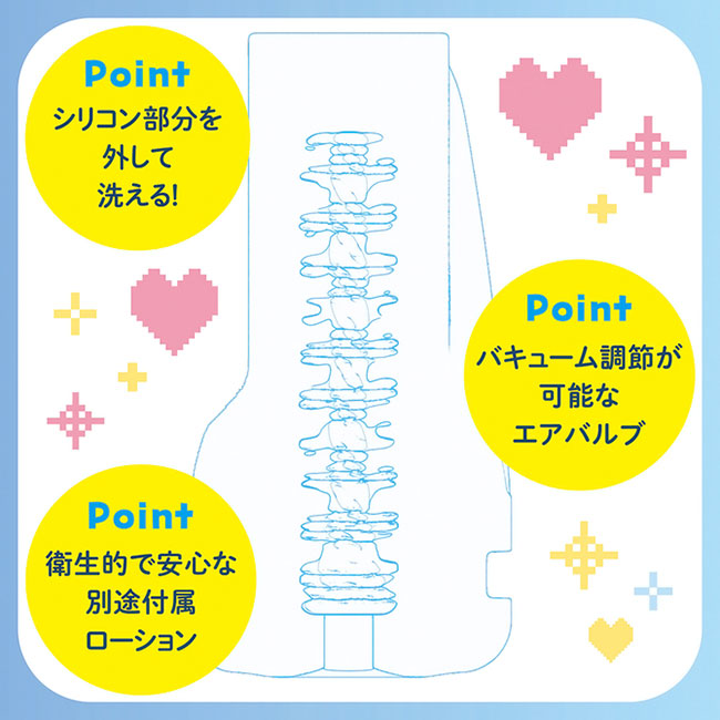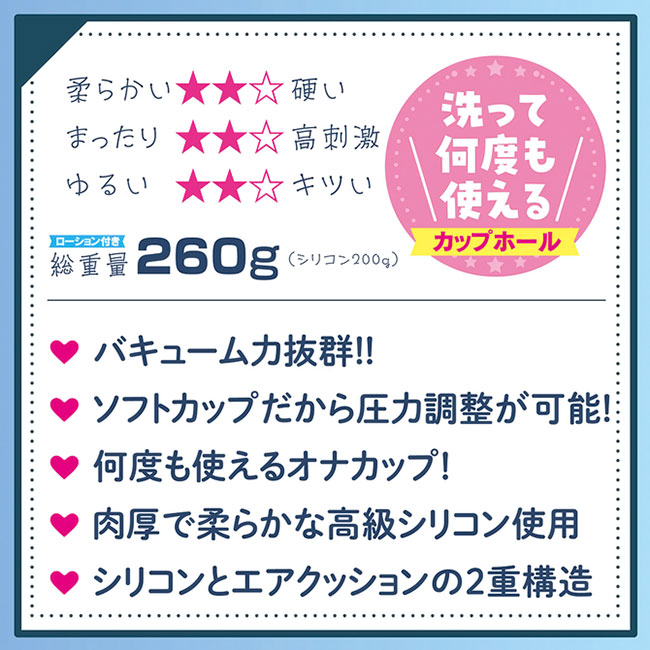 新感覚!洗って何度でも使える、ソフトカップタイプのカップホールです。 ソフトカップだから圧力調整が可能!調整可能なエアバルブでバキューム力も抜群! シリコンとエアクッションの2重構造で肉厚柔らかな高級シリコンを使用。 シリコン部分を外して洗えば何度でも使えます。 衛生的で安心な別途ローション付属!