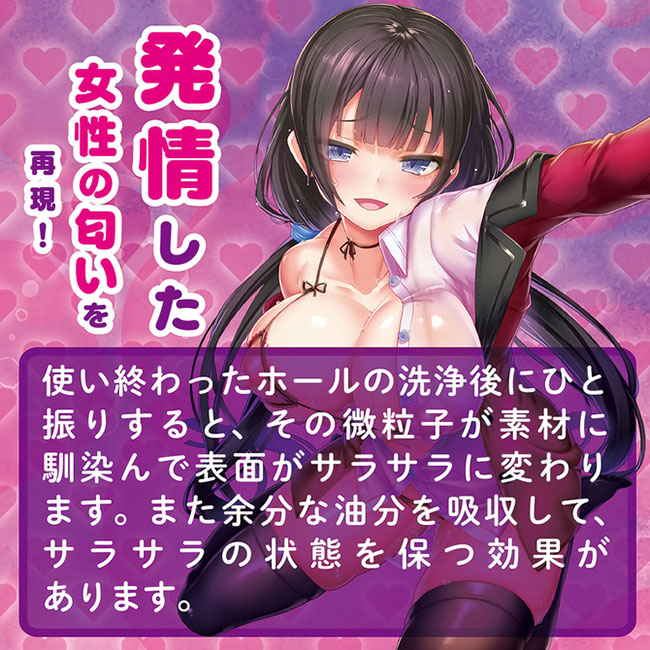 発情した女性の匂いを再現!あなたの快感を最大限に刺激します。 使い終わったホールの洗浄後にひと振りするだけで、微粒子が素材に馴染み、表面がサラサラに変わります。 また余分な油分を吸収して、サラサラの状態を保つ効果があります。