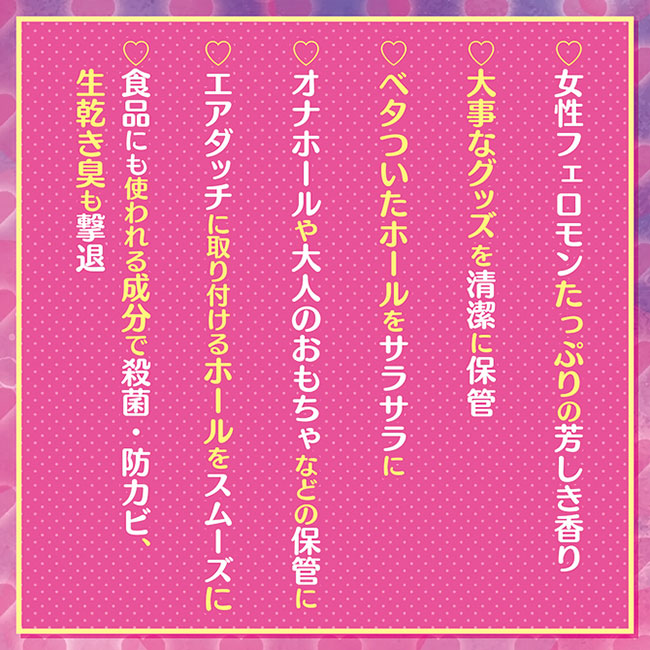 ・女性フェロモンたっぷりの芳しき香り ・大事なグッズを清潔に保管 ・オナホールや大人のおもちゃなどの保管に ・食品にも使われる成分で除菌、防カビ、生乾き臭も撃退