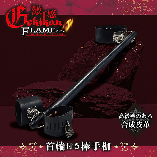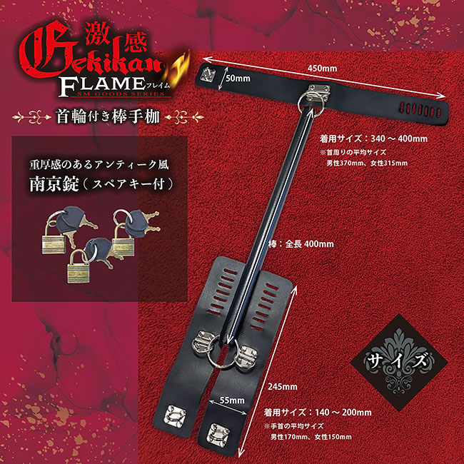 絶対に逃げられない…拘束される快感 激感フレイムシリーズ、黒レザー調仕上げの首輪付き棒手枷。 棒の端まできっちりと縫製されており、高級感が漂う仕上がりとなっております。 鈍く重みのある南京錠は、緊迫感へのアクセント。 首輪と手枷は、ベルトで長さを調節でき、女性・男性問わずお使いいただけます。 棒を使った腕の自由がきかない拘束は、ワンランク上の背徳感と羞恥心を高めます。パッケージサイズ:46×32×4cm総重量:155g商品サイズ:ベルトの長さ31.5cm/幅6cm/チェーンの長さ15.5cm/着用サイズ22〜26cm商品重量:145g