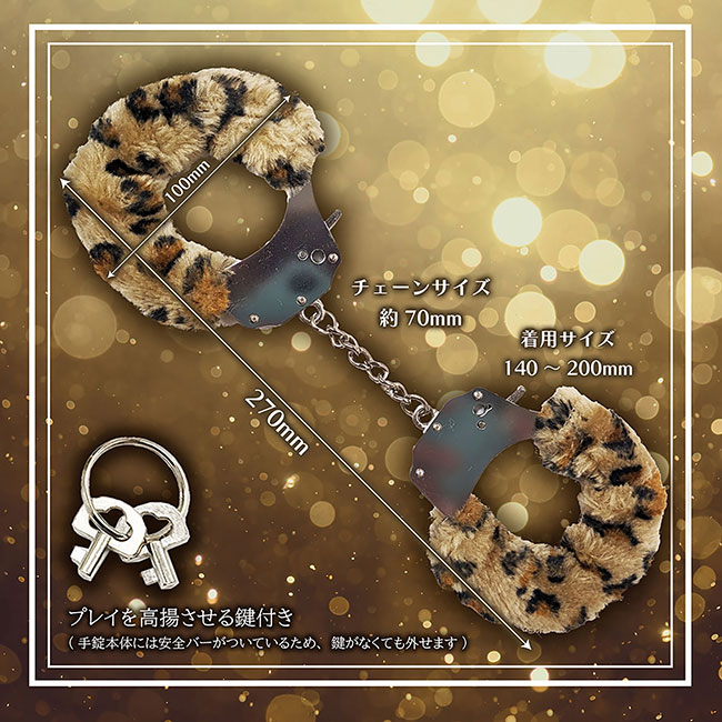 ずっしり重い本物さながらな重量感!! アニマル柄のファー付きタイプだから、手首に優しく安心して使えます。 見た目が可愛いから彼女も受け入れやすいSM手錠。ソフトな拘束プレイが味わえます。 安全バーがついているので、鍵がなくても外せます。 手を拘束するだけでひと味違った時間に…。 いつもの夜に、ちょっとだけスパイスを☆パッケージサイズ:11×7.5×3cm総重量:180g商品サイズ:10×27cm商品重量:165g付属品: 鍵×2個(スペアキー)