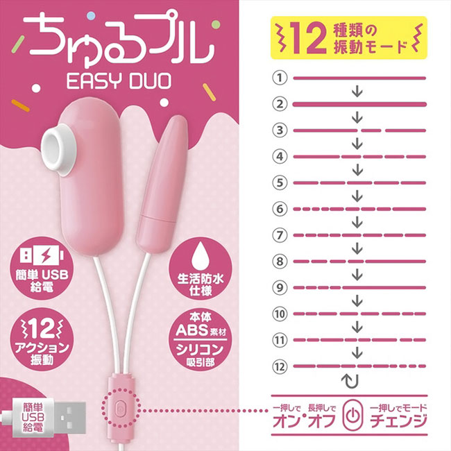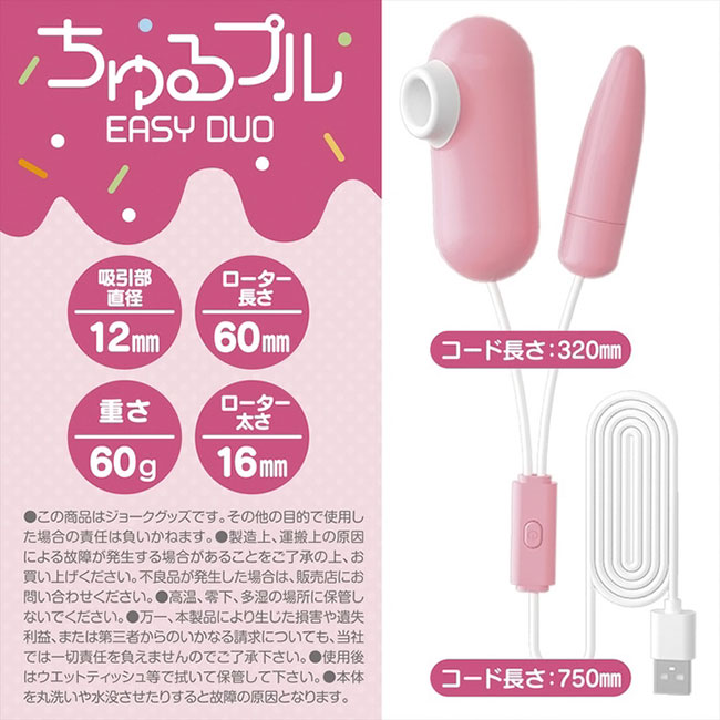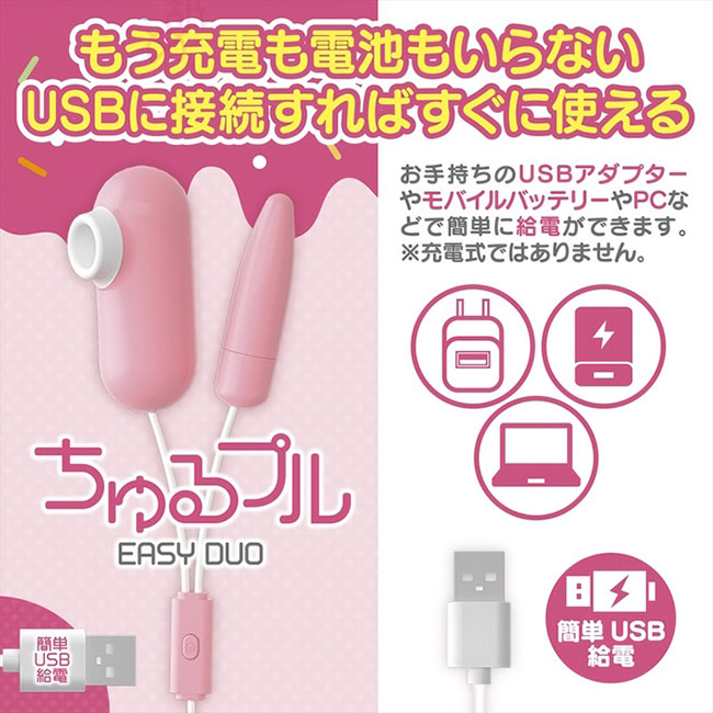 もう充電も電池もいらない☆USBに接続すればすぐに使えるちゅるプルEASYDUO!お手持ちのUSBアダプターやモバイルバッテリー等で簡単に給電が出来ます。吸引部はシリコンで柔らかく本体はABSになっています。手軽に安価に吸引とプルプルを楽しんでください。【USB給電】パッケージサイズ:13×10×4cm吸引ローター6.8cm×2.8cm ローター6.0cm×1.6cmコード全長110cm