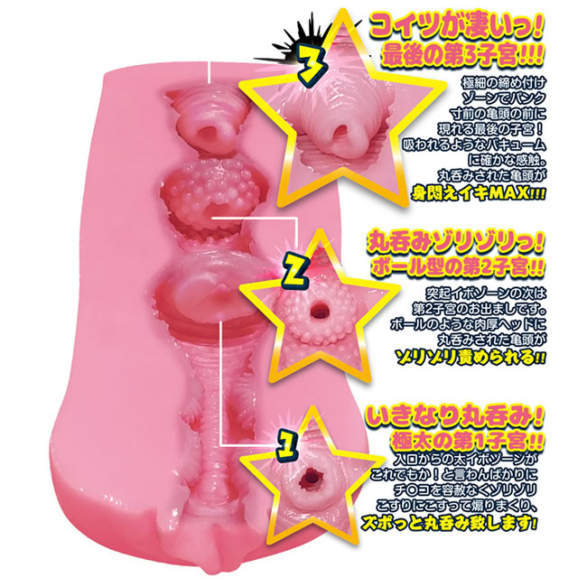 入り口からの太イボゾーンでゾリゾリ擦られたら、第一の極太子宮でパックンチョ! そして突起イボゾーンを超えたら第二の子宮!ボールのような肉厚ヘッド子宮で丸呑みゾリゾリ! その後は極細締め付けゾーンを通って最後の第三の子宮! 確かな感触!吸われるようなバキューム子宮で快感がほどばしる!
