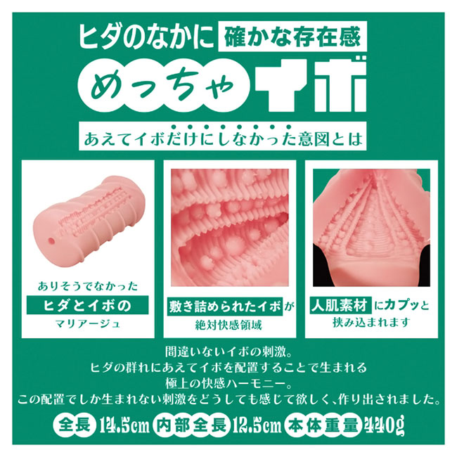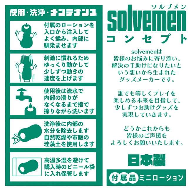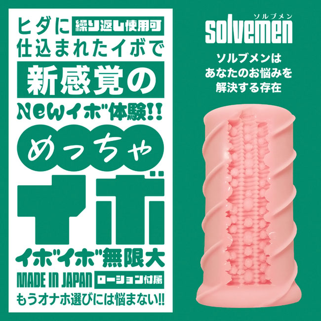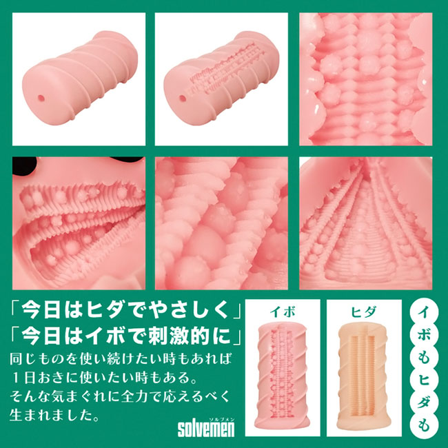「今日はイボで刺激的に」「今日はヒダでやさしく」同じものを使い続けたいときもあれば、1日おきに違うものを使いたいときもある。 そんな気まぐれに全力で応えたいです。それがソルブメンの生まれた意味だと思いませんか?今回のテーマは「めっちゃイボ」となります。 敢えてイボだけにしなかった意図をお教えしましょう。ヒダのなかに確かな存在感、イボは本当にイボ。 それは間違いないのです。しかし敢えてヒダの群れにイボを配置する事でしか生まれない、極上の快感ハーモニーがあることをどうしても感じて欲しかったのです。 あなたはオナホ選びに悩む必要はなくなります。あなたのためにソルブメンがいるのです。安心安全の日本製で繰り返し何度でも利用が可能です。