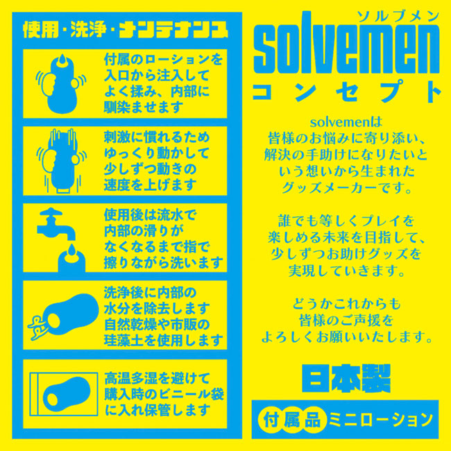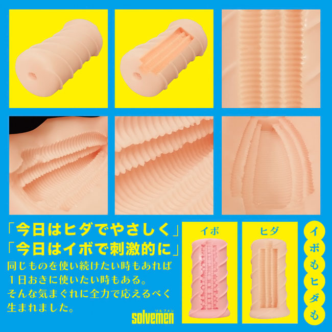 「今日はイボで刺激的に」「今日はヒダでやさしく」同じものを使い続けたいときもあれば、1日おきに違うものを使いたいときもある。そんな気まぐれに全力で応えたいです。 それがソルブメンの生まれた意味だと思いませんか?今回のテーマは「めっちゃヒダ」となります。今こそ王道のヒダで勝負する意図とは?ヒダは常に王道かつ安牌。 それは間違いないのです。しかしヒダも千差万別。配置や素材一つで快感は簡単に変わります。ヒダの絶妙な掘り込み具合で生まれる極上の擦られ感覚をお楽しみください。 あなたはオナホ選びに悩む必要はなくなります。あなたのためにソルブメンがいるのです。安心安全の日本製で繰り返し何度でも利用が可能です。