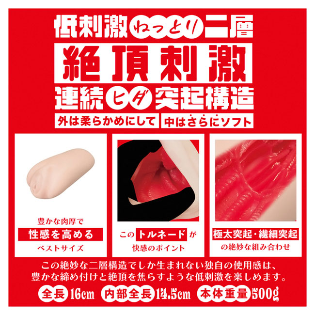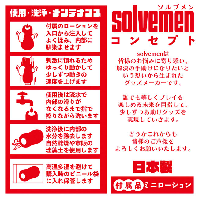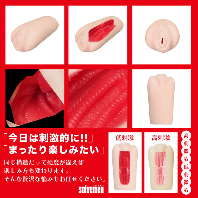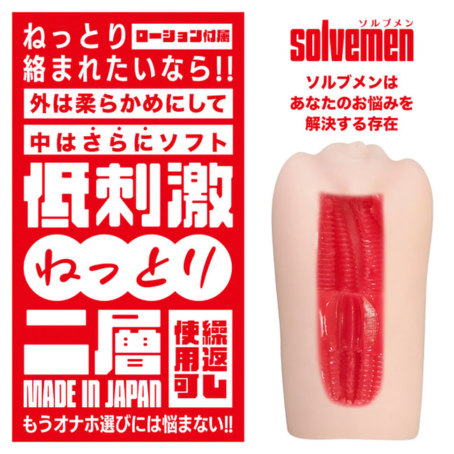「オナホは同じ構造でも素材が変わると使用感が違う」はい大正解です。 それは真理です。でも世の中は同じ構造かつ別素材のオナホを必ずしも発売してくれません。 それでは素材の違いによる使用感の変化を楽しむ事ができません。 そんな時こそsolvemenにお任せください!全く同じ構造ながら二層構造の内部素材を変えたものがコチラ。 「高刺激こすられ二層」と「低刺激ねっとり二層」になります。見た目は同じなのにアラ不思議。 高刺激と低刺激を楽しめます。まるで魔法のようにあなたの快感を惑わせる事でしょう。 素材だけではございません。「絶頂刺激連続ヒダ突起構造」と名付けた特殊な内部構造をご覧ください。 どの素材でも一定の感度を担保する安定感の高い内部構造となっております。 あなたはオナホ選びに悩む必要はなくなります。あなたのためにソルブメンがいるのです。 安心安全の日本製で繰り返し何度でも利用が可能です。