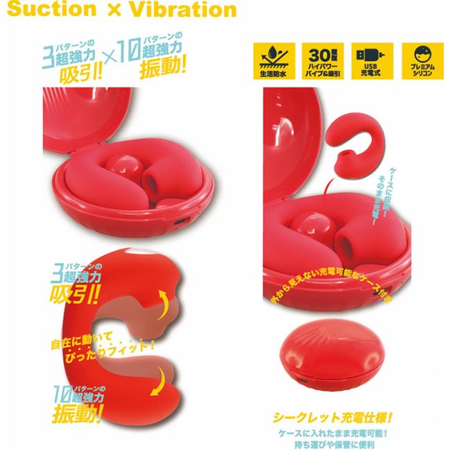 30種類から選べる豪華なW刺激。吸引は強力で吸い付き抜群。10種の振動は弱いから超強力まで様々。 女性のために考えられた吸引バイブで本当の快感を体験。フレキシブルに動かすことのできる本体は ピッタリフィットが出来るように角度調節が自由自在。「あたらない」が無いようにしっかり設計されています。 ナカイキのみ、クリイキのみでも使用可能。2点攻めでナカとクリトリスのWイキも体験してください。 充電ができる収納ケースを採用。充電中に本体が露出しないようにひと工夫しました。 ケースにしまって充電すれば何を充電しているかわからないし衛生的です。ケースにいれれば持ち運び、収納も便利。 パワフルなのに静音設計なのでお隣さんが気にならない。水洗いOKの生活防水仕様!高品質シリコンを採用しスベスベな肌触り。 連続時間約120分と長時間使用可能。