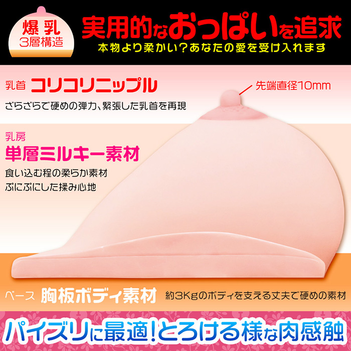 リアルさを追求した夢のようなIカップおっぱい! 爆乳好き必見!手のひらには収まりきらないIカップ爆乳が登場しました!おっぱいのフォルムはもっともエロい釣鐘型を採用。見た目だけでも十分に楽しめるおっぱいですが、もちろん触り心地も抜群で柔らかくてとろけるような乳房に、リアルさを追求した乳首はコリコリとした素材を使用しています。硬めの胸板素材で乳房を支えているので、激しいプレイにも対応。重さが2700gと超重量級で胸の谷間は深さ9cmと、パイズリには最適の仕様となっています。現実ではなかなかお目にかかれないIカップ爆乳を、是非堪能ください。