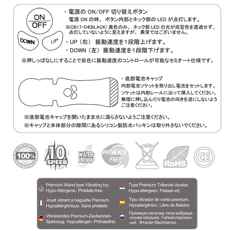 深層部へ振動を伝える! デンマレディプレミアムが生み出す重振動は、より深い部位まで届けることが可能になり、ヘッドが触れる力を変更することで表層から深層部と、より自由に振動を操ることが可能です。電池を使用するため、コードレスで取り回しやすく持ち運びに便利で使用シーンを選びません。さらに、高い防水性能を誇り、バスタイムでの使用やメンテナンスも容易です。ヘッド&ネックは一体成型により柔軟性と剛性を両立。防水仕様。10段階超強力振動。ピュアシリコン素材。