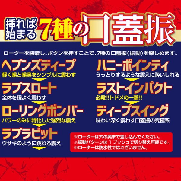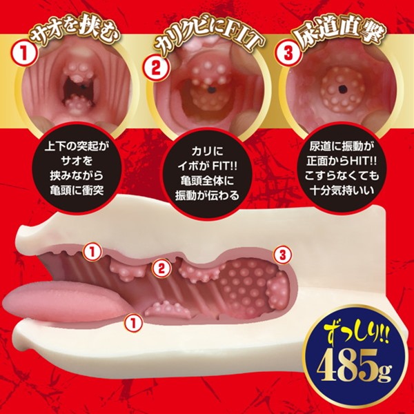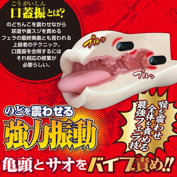 のどを震わせサオや尿道を強烈に責める!!最強のフェラ技「口蓋振(こうがいしん)」を楽しめるフェラホール!ローターを振動させながらシゴくのは勿論、振動のみの刺激を楽しむ亀頭オナニーも可能!奥まで挿入すれば、亀頭をロックしながら尿道に振動が直撃し、ストロークしなくても超気持ちいい!重量が485gあるので、口に本当に頬張られているような圧迫感で満たされながら、振動を楽しめます。亀頭ローターとフェラホールのいいとこどりな深い快感をサオ全体で楽しもう!!