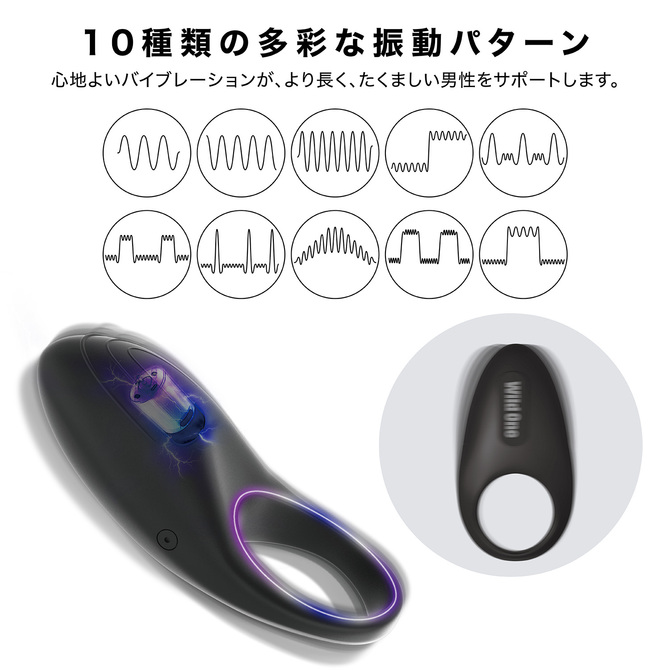 適度な締め付けで、持続力もサポート。 10種類の振動パターンにより、プレイに心地よいリズムを もたらします。
