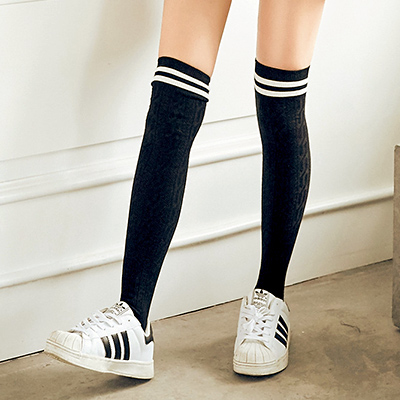 ライン入り ケーブル編み カジュアル ニーハイソックス ブラック