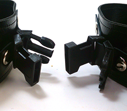 枷に付いたプラスチックのバックルを合わせると、カチッと枷同士を接続させることができます。こちらの「太ももM字」は両太ももをガッチリ固定して、正座・体育座り・ひざまづき等の体勢に拘束することができます。手枷など「カチッっと拘束シリーズ」と接続することができますので、バリエーション豊かな体勢で拘束することが可能となります。バックルを外したい時もワンタッチで簡単に取り外せますので、安心・安全です。カチッと連結して楽しい、新しいSM枷を是非お試しくださいませ。